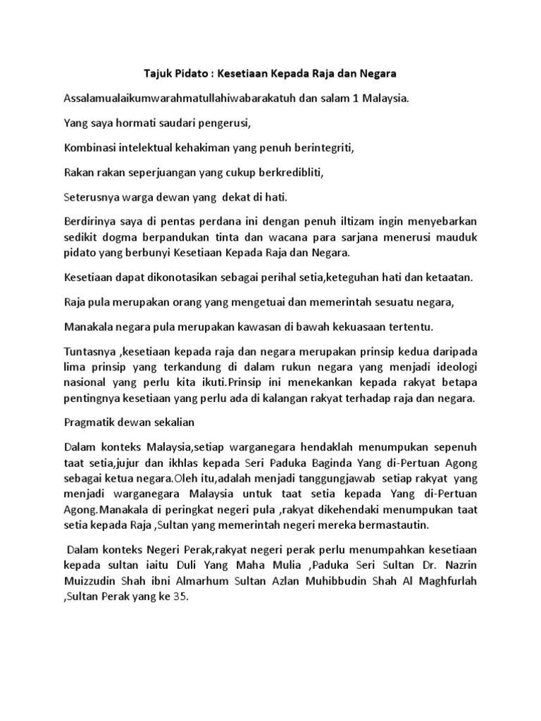 Kesetiaan Kepada Raja dan Negara Assalamualaikumwarahmatullahiwabarakatuh dan salam Sejahtera Yang saya hormati saudari pengerusi Kombinasi intelektual kehakiman yang penuh berintegriti Rakan rakan seperjuangan yang cukup berkredibliti Seterusnya warga dewan yang dekat di hati. Pendidikan Moral On Twitter Taat Setia Kepada Raja Dan Negara Kepatuhan Dan Kesetiaan Kepada Raja Dan Negara. Contoh-contoh historiografi tradisional di antaranya ialah Sejarah Melayu Hikayat Raja-Raja Pasai Hikayat Aceh dan masih banyak lagi.